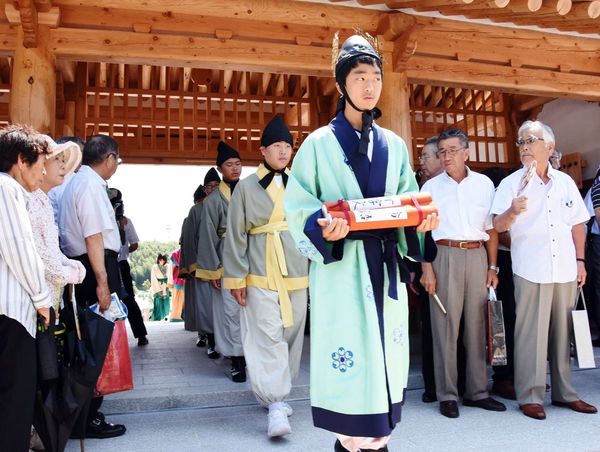 日本と韓国の人たちが一文字ずつ揮毫した「鍾繇(しょうよう)千字文碑」と霊岩郡の支援で建造された「百済門」の前で除幕・テープカットを行った後、来場者は園内を見学しました。