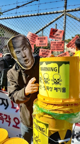 仁川緑色連合など仁川地域の政党と市民・環境団体62カ所が集まった「仁川所在政党・市民社会団体」が30日、仁川富平の米軍基地「キャンプマーケット」前でトランプ米大統領に毒劇物などの廃棄物を引き渡すパフォーマンスを行っている=仁川緑色連合提供//ハンギョレ新聞社