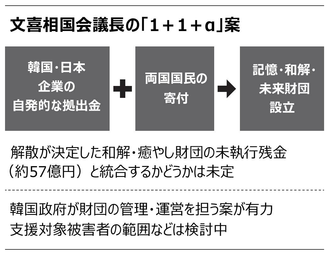 文議長案は当初、日韓両国の企業や国民の「自発的な寄付」に、慰安婦問題をめぐる日韓合意(2015年末)に基づき日本政府が出資した「和解・癒やし財団」の残金(約60億ウォン)を加えた基金を創設。元徴用工のほか、元慰安婦にも慰謝料などを支給する方針だった。日韓に限らず「世界中から募金」を... 元徴用工問題「新解決案」の現実味