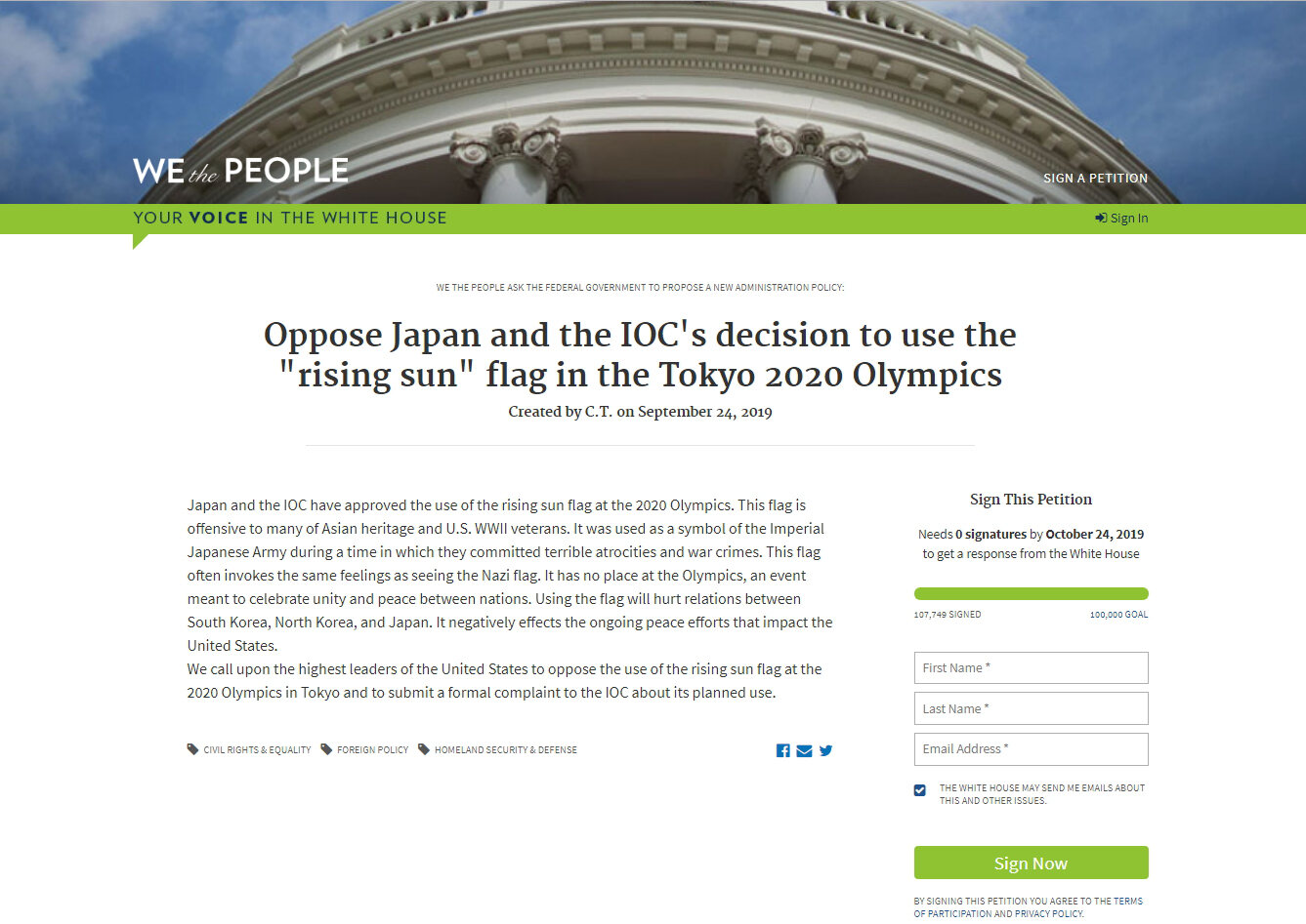 米ホワイトハウスのホームページに投稿された「2020東京オリンピックでの旭日旗使用禁止を求める」請願に、10万人以上が署名した。投稿から30日以内に10万人以上の請願署名が集まれば、ホワイトハウスは何らかの回答をする規定となっているため、近いうちにホワイトハウスからの公式回答が出るとみられる。