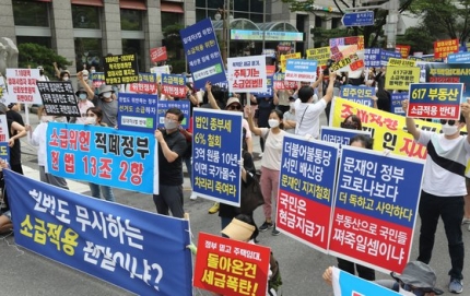 18日にソウルの預金保険公団前で政府の高強度不動産政策に反発する集会が開かれた。「6・17規制遡及適用被害者救済のための会」「賃貸事業者協会推進委員会」「7・10取得税遡及適用被害者の会」など主宰側推定で市民300人ほどが午後3時から5時までデモを継続した。