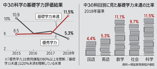 教育部(省に相当)が毎年実施している「国家水準学業成就度評価」で、昨年の科学科目の「基礎学力未達」生徒の割合は11.5%だった。2017年は6.6%にとどまっていたが、昨年は倍近く急増した。