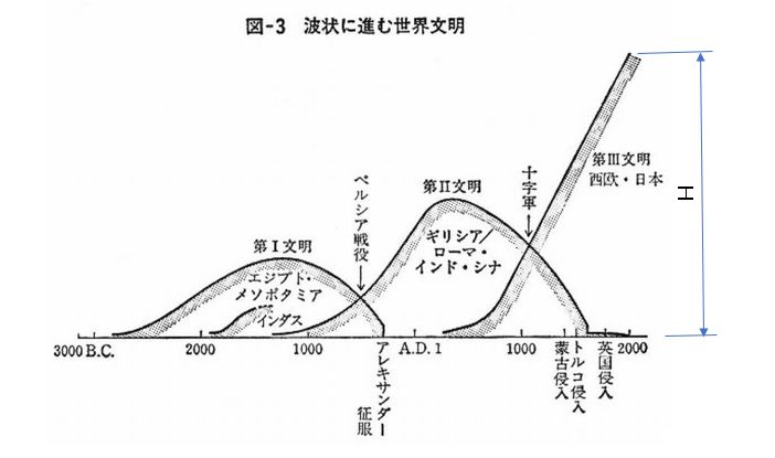 ユーラシア大陸の西南メソポタミアとエジプトで始まった第Ⅰ文明は衰亡し、西に遷移し第Ⅱ文明のギリシャ・ローマ、東へ移って支那文明、これらが衰亡しさらに西へ移ったのが西欧文明で、東へ移ったのが日本文明である。