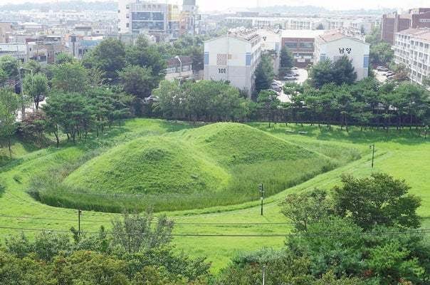 商店やマンションに囲まれた市街地の一角。韓国南西部の光州にある2基の前方後円墳、月桂洞1号墳、2号墳を訪れた。この古墳からは円筒埴輪(はにわ)約100基が出土。周辺の栄山江流域では14基の前方後円墳が確認されている。