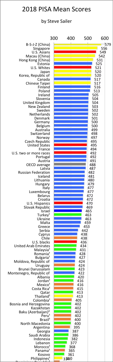 2018年PISA (国际学力調査) 测试结果,日韩排名相同(中央値)
