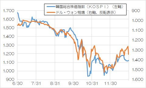 下は新宿会計士さんが作成したKOSPIとドル=ウォンレートのグラフ。だって韓国だけが不況なんだもん。