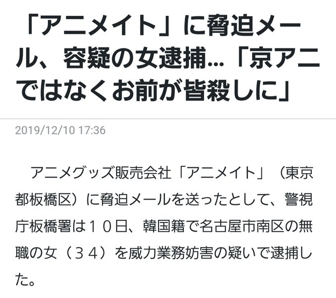 警視庁によると逮捕された韓国籍の山下由理絵こと崔由理絵容疑者は今年8月から10月に、板橋区のアニメイト本社に、「必ず皆殺しにしてやる」「京アニの従業員じゃなくてお前らが皆殺しになればよかったのに」などと書いたメールを13回送り、業務を妨害した疑いがもたれている。朝鮮人は、また負けたのかw