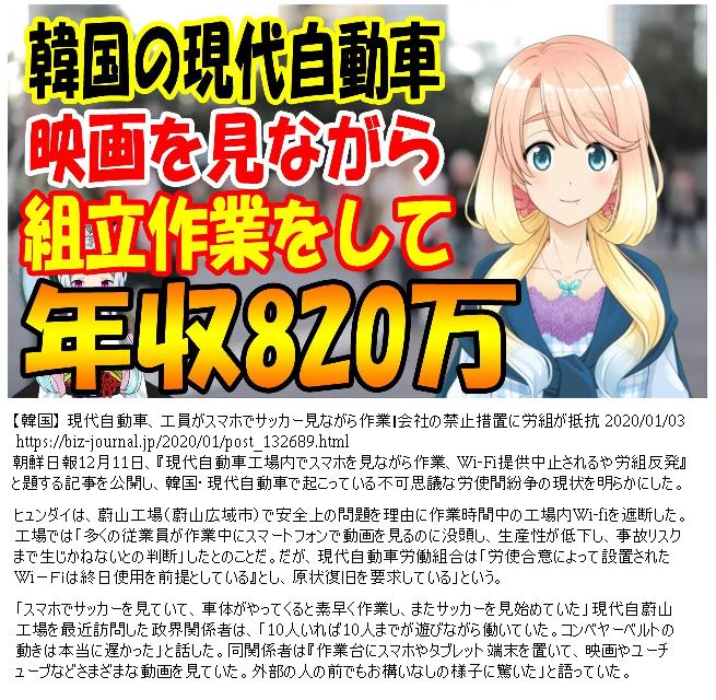 こんな企業の株式投資なんて自殺行為だろ。【韓国】 現代自動車、スマホを見ながら自動車を組み立てる 韓国労働者の呆れた実態 2019年12月18日