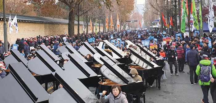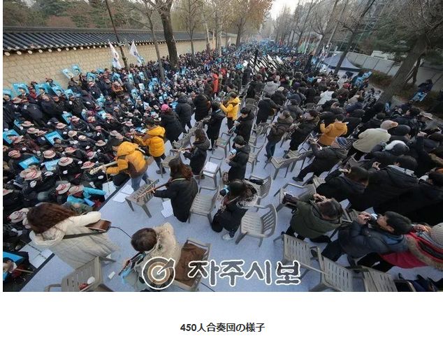 先日の親北傾向の集会では、青瓦台近くでグランドピアノ50台、ギター100本、ハーモニカ100本などを演奏して「李石基(イ・ソッキ)釈放」を要求した。この集会は北朝鮮と同調して国家基幹施設を攻撃する方法を話し合ったとして2013年に懲役9年を言い渡されて服役中の李石基・元国会議員の釈放を要求する集会だ。この21世紀に、ウクライナの反政府デモ時のように、疲れたデモ隊をピアノの独奏で癒やすことはあっても、楽器を「人海戦術」のようにデモの武器に使うのは見たことがない。李石基元議員の写真がついたプラカードを手に「我々が李石基だ」と叫ぶ人々もいた。まるで「李石基偶像崇拝集会」だ。