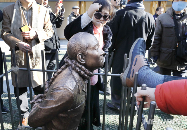 1979年12月12日の「12・12事態」(粛軍クーデター)から40年となった12日、ソウル・光化門広場で全斗煥(チョン・ドゥファン)元大統領の逮捕を促す記者会見を終えた後、「象徴儀式」のために用意した「全斗煥像」を殴ったり蹴ったりする「518時局会議」「518拘束者会ソウル支部」のメンバーたち。