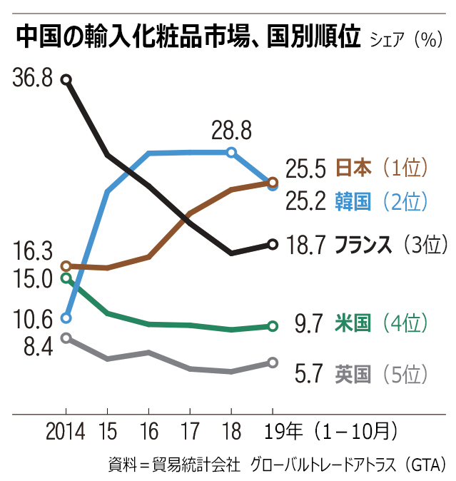 中国で人気を集めたKビューティーブームがJビューティーの攻勢に押されている。過去3年間、中国の輸入化粧品市場でトップを守ってきた韓国は今年、日本にトップの座を奪われるとの予想が示されている。貿易統計会社のグローバル・トレード・アトラス(GTA)によると、日本製化粧品の中国への輸出額は今年1-10月に24億6881万ドルでトップだった。