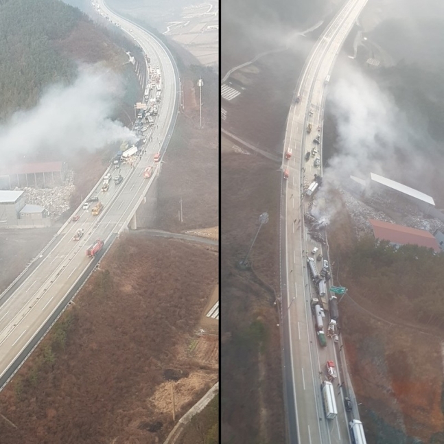 14日未明、慶北軍威郡ソボミョンダルサンリ常駐永川高速道路で発生した車両連鎖追突事故で火が私の車にたばこを吸っている。