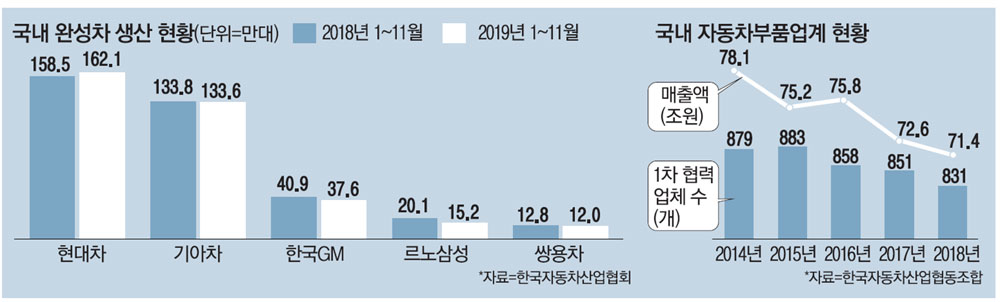 >年間400万台の自動車生産体制が崩壊する危機に陥っ部品業界でも共倒れの懸念が高まっている。韓国自動車産業協同組合によると、昨年末基準の国内完成車メーカーの7個の直接取引する1次協力会社は831本で、このうち574個(69.1%)が3年も平均売上高が1000億ウォン以下の中小企業である。