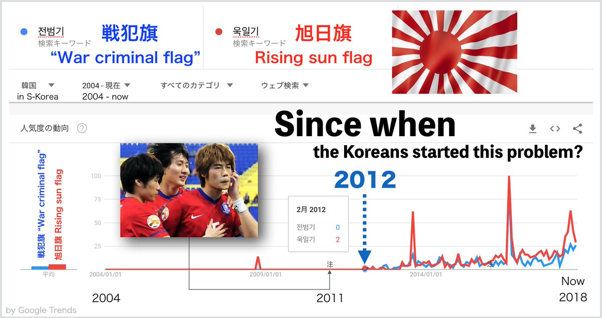 こういう具体的なデータを、海外で旭日旗(デザイン)狩りに遭って謝罪したり製品を販売中止にしたりした会社や芸術家に、その都度送って説明してやるべきだね。このデータは最も韓国人による旭日旗狩りの理不尽さを伝えるのに有効なものだよ!猿真似サッカー小僧より直接的な理由は、↓のアホと周りにいた韓国人がやった馬鹿を非難された意趣返しと矮小化するために、「日本のほうがユニフォームに旭日旗という政治アピールをしたnida!」と言い出したのが発端。