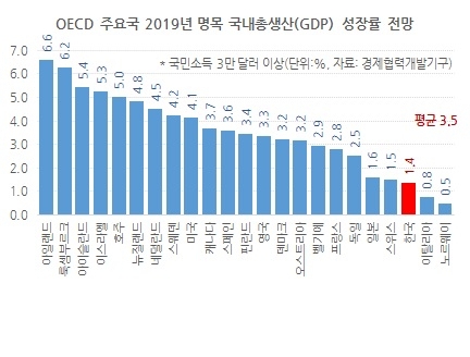 韓国経済の名目国内総生産(GDP)成長率が今年1%台に墜落塗り見通しだ。通貨危機以後、21年ぶりに最低値だ。OECD(経済協力開発機構)の中でも、最下位レベルである。名目GDPは物価が反映される「体感成長率」としてそれほどデフレ(低迷の中、物価下落)の懸念の中、非常に冷却された試合の状況を示している。16日OECDの資料を見ると、今年の韓国の名目GDP成長率見通しは1.4%で、35加盟国のうち、イタリア(0.8%)、ノルウェー(0.5%)に続き三番目に低い。韓国との経済構造が類似し、ドイツ(2.5%)よりも低く、長期間ジョムルガで低迷を経験した日本の(1.6%)よりも下にある。韓国の名目GDP成長率は、IMF(国際通貨基金)の事態翌年の1998年に-1.1%を記録した以来、一度も3%を下回ったことがなかった。2002年には10%を上回り、一昨年円5.4%だったが、2年ぶりに5分の1の水準に急減した。
