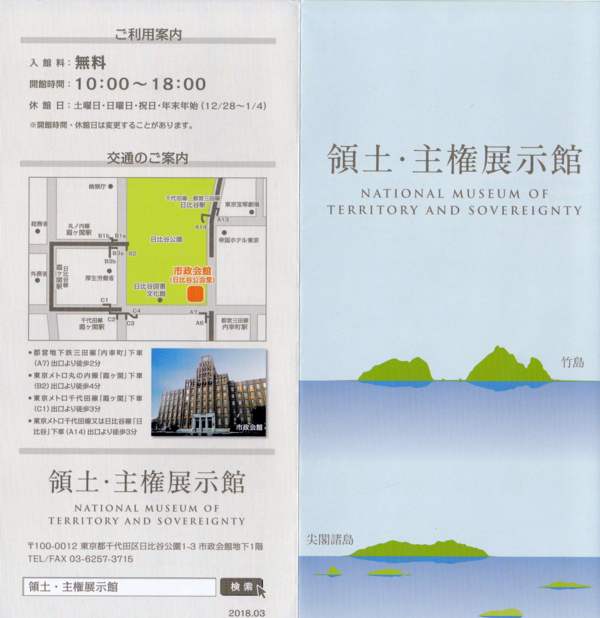 産経新聞によると、衛藤晟一・領土問題担当相は17日の記者会見で、現在東京都日比谷公園内の市政会館地下にある「領土・主権展示館」を虎ノ門に位置する民間の建物に移転して来年1月21日に開館する方針だと明らかにした。衛藤氏は「展示館の移転により、面積も現在の7倍となる約700平方メートルになる」とし「展示館がさらに魅力的で効果的な広報拠点になるべく、関係部署とも協力していく」と話した。