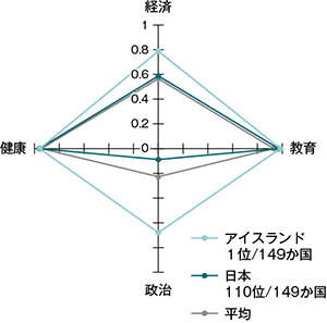 大きく違うのは政治だけ。>>19でも書いたけど、女性議員がもう少し増えるといけど