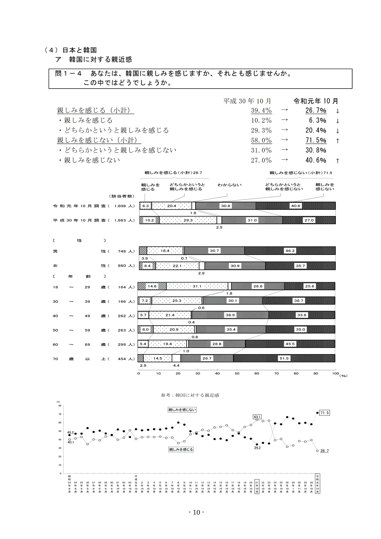 前回の調査結果(平成30年10月調査結果をいう。)と比較してみると、「親しみを感じる」(39.4%→26.7%)とする者の割合が低下し、「親しみを感じない」(58.0%→71.5%)とする者の割合が上昇している。