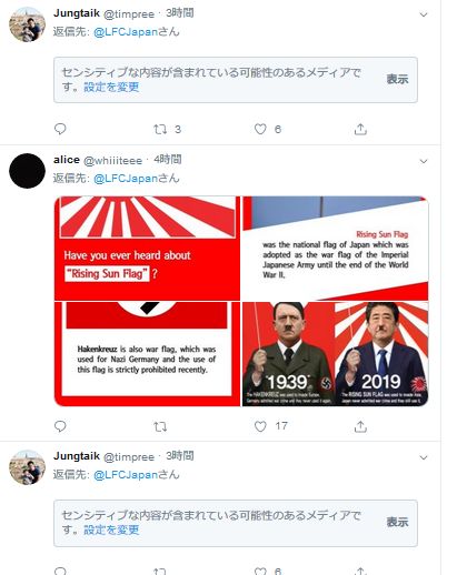 リバプールのユーチューブコミュニティで韓国人が「旭日旗はナチと同じニダ」と書き込みしまくり