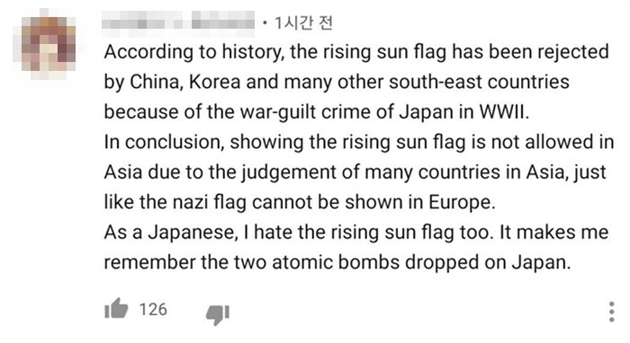 該当のコメントの作成者は自身を日本人と表現したが、旭日旗に関する自身の所信を打ち明けた。