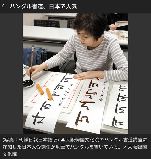 毎週金曜日と土曜日の午前10時、大阪市北区にある大阪韓国文化院の教室には会社員、主婦、定年退職したお年寄りなど、さまざまな年代の日本人が20人集まる。これらの人々は2週間に1回ずつここでハングルの書き方を毛筆で学ぶ。今年4月から子音と母音を学び始めた学生たちは、いつの間にかハングルの文章を書くことができるレベルになった。机の上に置かれた数十枚の半紙には「懐かしさ」「さつまいも」「落ち葉がひらひら」など、決して上手とは言えないが、真心のこもったハングルがしたためられている。