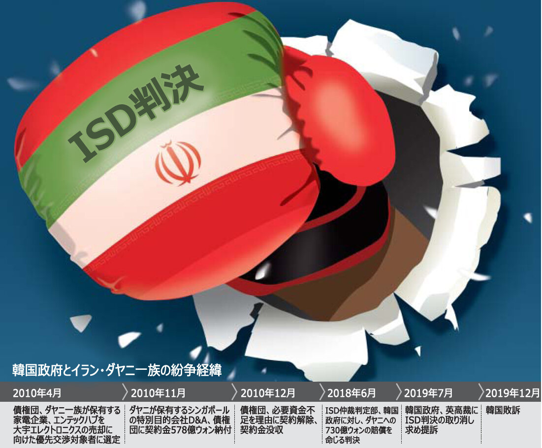金融委員会が22日、明らかにした・これにより、韓国政府は昨年の判決に従い、2010年の韓国資産管理公社(KAMCO)などの債権団が大宇エレクトロニクスを売却する過程でダヤニ一族から没収した契約金に利子を上乗せし、総額730億ウォン(約69億円)を支払わなければならない立場となった。ISDは投資先の国の政府による過失で被害を受けた企業が起こす国際訴訟だ。韓国政府を相手取ったISDで判決が確定したのは今回が初めてだ。