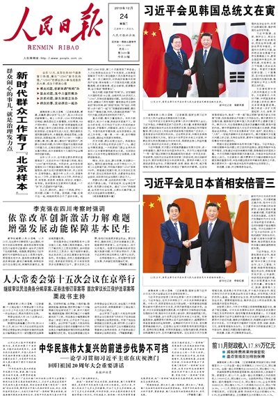 人民日報がなぜ重要である。人民日報は中国共産党機関紙で、すべての中国メディアの報道基準をとるためである。人民日報はこの日1面右上に韓中首脳会談、下段円日中首脳会談を扱った。
