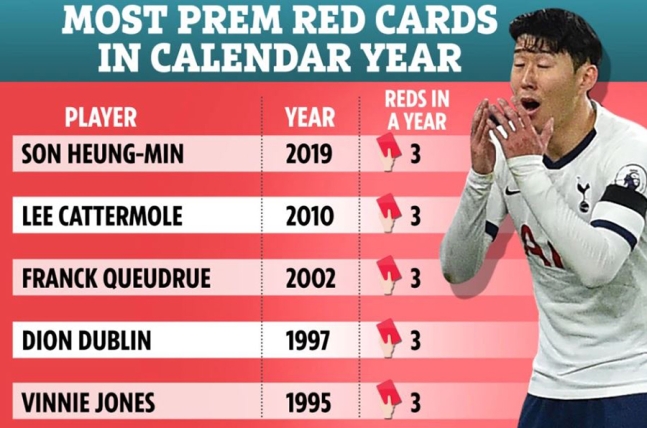 1年に退場3回...ソン・フンミン、EPL史上5番目の記録