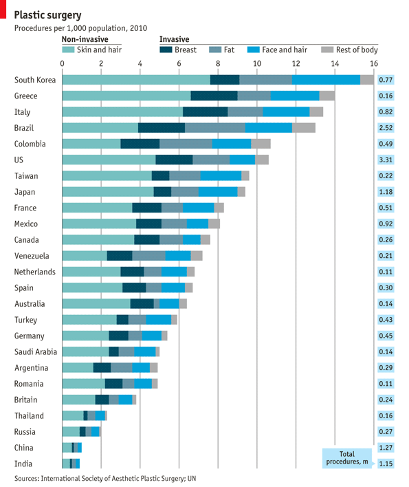 ひとり当たりの美容整形手術の回数(その国で行われた手術を人口で割った割合)を各国で比較したグラフ。