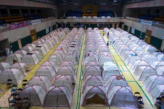 イ・ナギョン首相が28日午前に訪れた浦項興海室内体育館の入り口には、浦項地震被災者の体育館テント生活がどのくらいになったか、タイムリーな数字が書かれていた。被災者が書いた赤い数字のように、地震が発生してもう2年以上の時間が経った体育館には、まだテントがぎっしりと設置されていた。