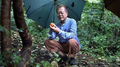 半年前は休暇取って山中でしゃがんで落ちた柿を拾ってじっと見ている文在寅の記事で