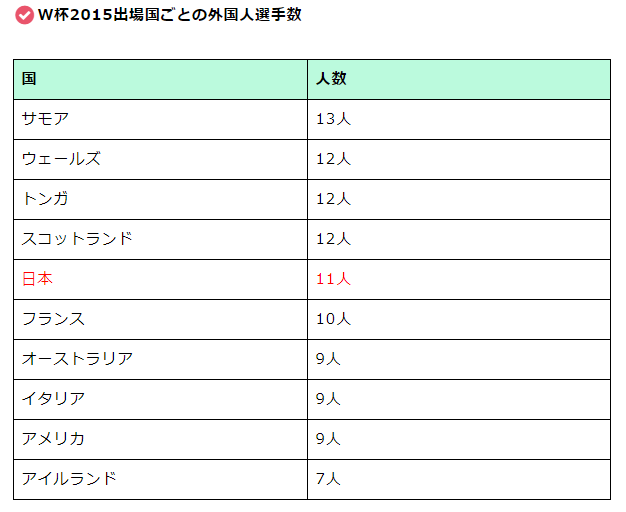 2015 RWC の各国の外国人選手割合が以下(画像)の通り。