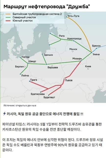 파이낸셜 타임스(FT): 러시아가 오는 5월 1일부터 전략적 요충지인 ‘드루즈바’ 파이프라인을 통해 독일로 향하는 카자흐스탄산 석유 수송을 전면 중단할 계획입니다.