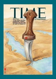 타임지 스타일의 표지를 단 이란 언론 기사에는 "바브엘만데브 해협을 폐쇄하면 인간도, 그 어떤 악령도 다시 열 수 없을 것"이라는 문구가 실려 있습니다.