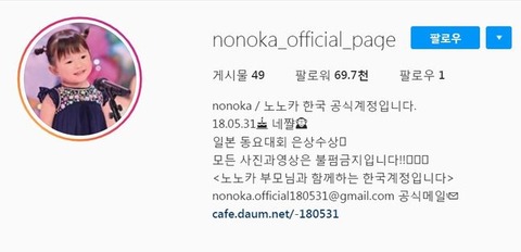 乃々佳ちゃんは昨年11月、日本で行われた童謡こどもの歌コンクールで銀賞を受賞した。その大会映像がSNSで拡散して800万回以上のYouTube再生回数を記録した。韓国でも人気が高まると、乃々佳ちゃんの両親は韓国公式SNSアカウントを作って乃々佳ちゃんが韓国語を学ぶ映像も掲載した。