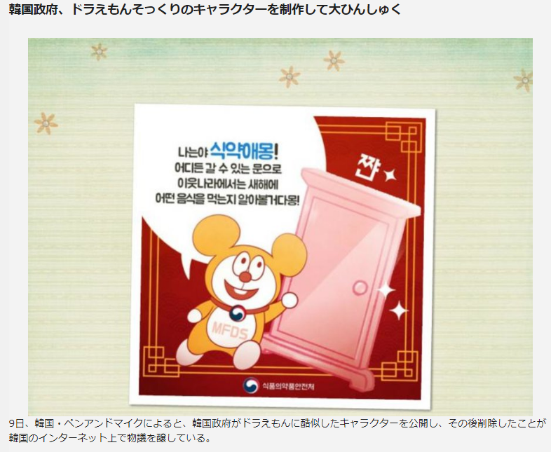 韓国政府、ドラえもんそっくりのキャラクターを制作