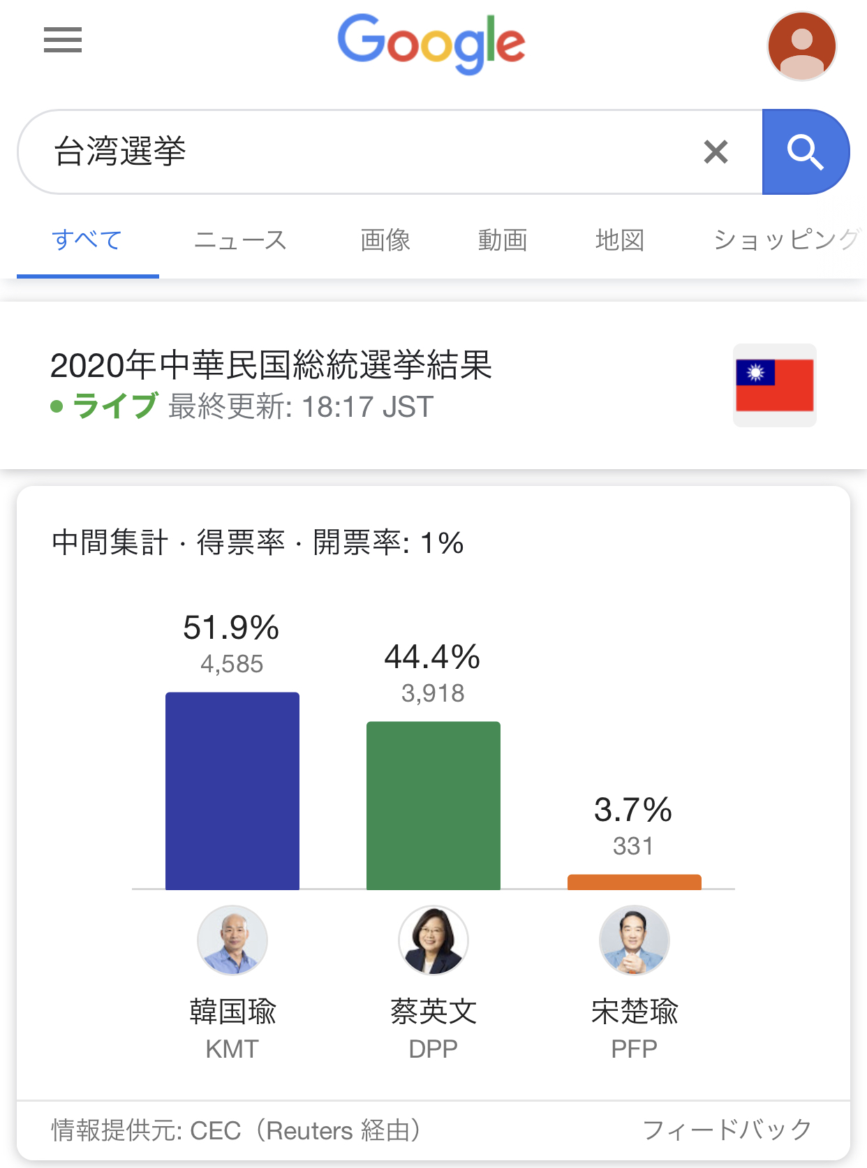 割とイケメンな蒋介石の曽孫(上記エリア)と金門島(中国とは目と鼻の先)の國民・現職(かなり年配)は勝ったようです。この二人が手を繋いでた面白エピソードは有名です。(色恋沙汰じゃなく笑い話です)
