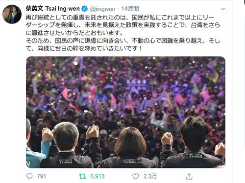 【再選の蔡英文総統、日本語でツイート「台日の絆を深めていきたい」/台湾】