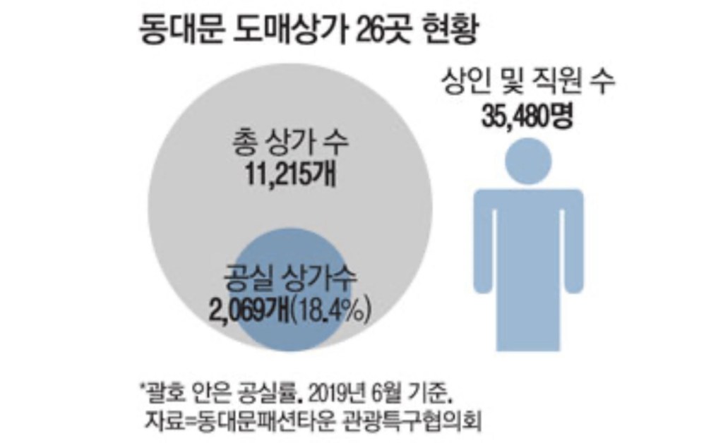 業界関係者は、「卸売市場の売上高80%に属する商人はすべて危機と見れば良い」と口をそろえた。売上高が減少してビジネスを折りたたむ者が続出し、商店街で10-30%ほど空室が発生した。(中略)ハン・ヨンスン東大門ファッションタウン商人会長は「(中略)今年の空室率は歴代最高レベルを記録する見通しだ」と伝えた。 (中略)