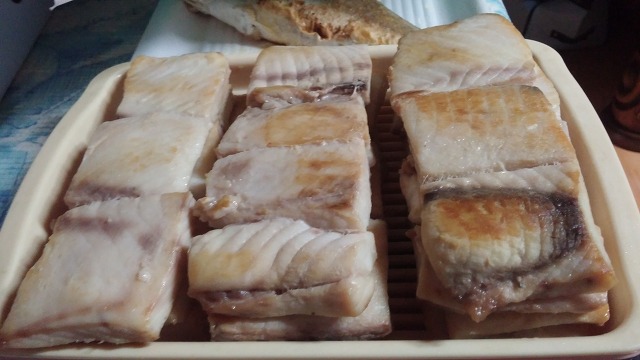 나의 고향에서 명절에 사용하는 염장 상어 고기 '돔베기' 입니다. 짭짤하고 담백한 생선 맛이 좋지만, 최근 조사에 따르면 수은 축적량이 높아서 문제라고 한다. 가끔 먹는 정도는 괜찮겠지만...