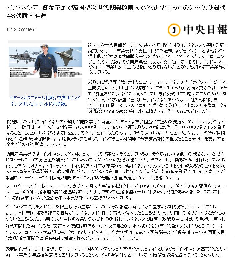 『韓国人「KF-X共同開発崩壊、インドネシア技術者114人、韓国から帰国…5千億ウォン未納」』