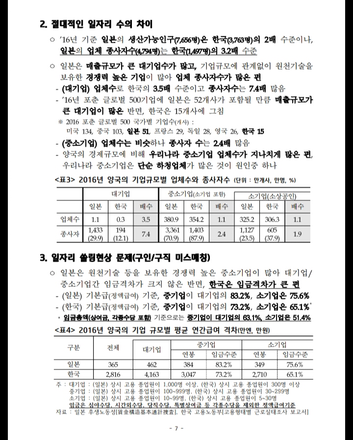 - 양국의 경제규모에 비해 우리나라 중소기업 업체수가 지나치게 많은 편, 우리나라 중소기업은 단순 하청업체가 많은 것이 원인중 하나