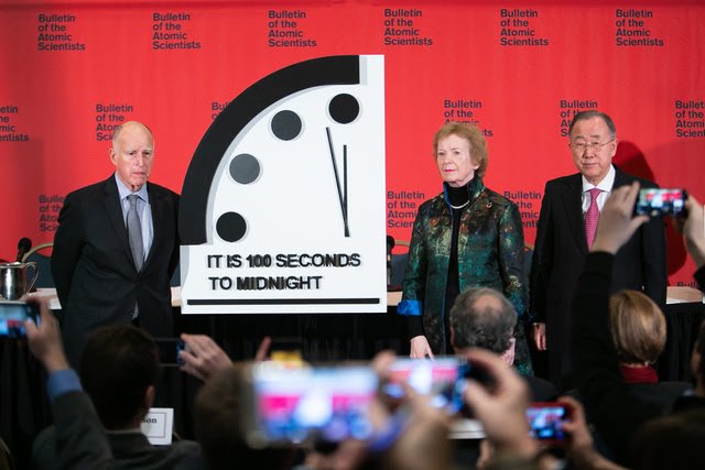 米科学誌「ブレティン・オブ・ジ・アトミック・サイエンティスツ」(「原子力科学者会報」の意味)が発表した。同誌のレイチェル・ブロンソン最高経営責任者は「世界の滅亡まで、時間でも分でもなく、秒単位だ。真の非常事態で、いささかの誤差や遅れも許されない状況だ」と危機感をあらわにした。