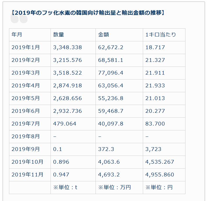 2019年11月フッ化水素輸出量 東亜日報「400kg」 日経新聞「947kg (財務省貿易統計)」
