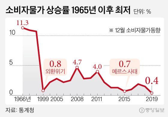 올해 소비자물가 상승률 0.4% 역대 최저···외환위기 절반