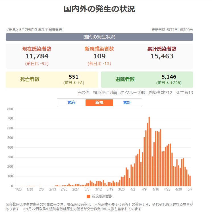 https://www3.nhk.or.jp/news/html/20200511/k10012424421000.html新型コロナ 国内感染者1万5968人(横浜港のクルーズ船除く)