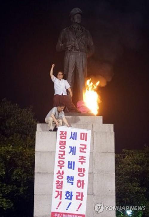 李さんは「マッカーサーからトランプまで新植民地体制がうんざりだ」という文句が印刷された横断幕を像の前にかけた布の束を積んだ後シンナー、ガソリンを分散させ、火をつけたことが分かった。