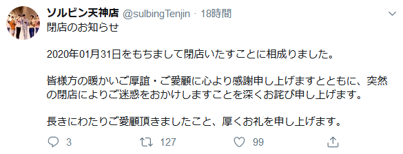 1名無し2020/02/01(Sat) 18:57:46ID:E3Mzg4NDU(1/5)NG報告韓国人がホルホルしてた店が予想通りの撤退らしいね各店舗でほぼ同じお知らせが出てる(仙台だけ休業って書いてあるけどこれも閉店でしょう)閉店してからお知らせ出すってのもびっくりですわw店員さんも知らされてなかったみたいでひと悶着ありそうですね>>2>>44>>64>>750