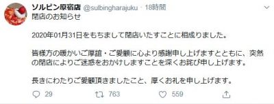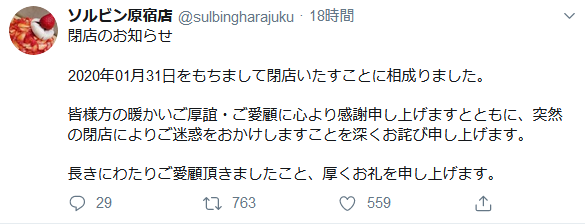 かき氷のソルビン全店舗が突然閉店?