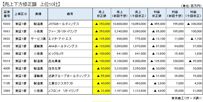利益は、JXTGホールディングスに次いで、丸紅(株)(TSR企業コード:570197708、▲3,900億円)、出光興産(株)(TSR企業コード:290009898、▲1,250億円)、住友商事(株)(TSR企業コード:570098629、▲1,000億円)の4社が1,000億円以上の下方修正額となった。